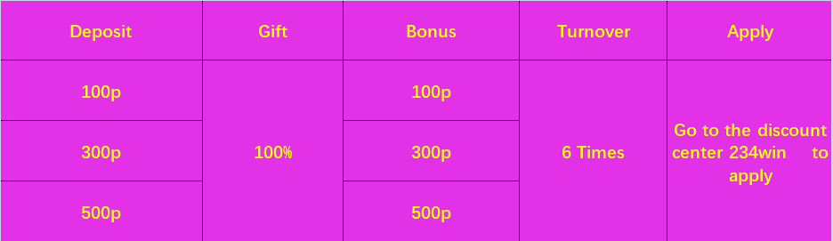 From now on, register an account at 234WIN.PH, add a bank card, deposit P100 for the first time, you can get P100 as a bonus, the maximum bonus limit is P500, only Slot, Fishing games, what are you waiting for, hurry up and invite your friends to receive the bonus together. Join 234WIN.PH immediately, many of discounts are waiting for you!